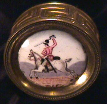 7405 An Enamel Box with a Mounted Horseman, Circa 1820, set in a brass box with a Greek Key design motif. Probably English in origin