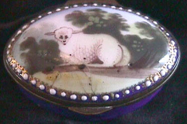 7394 A Bilston Oval Patch Box, Circa 1790, painted with a Lamb in a landscape setting. Original mirror. Cobalt blue ground color. (No restoration).